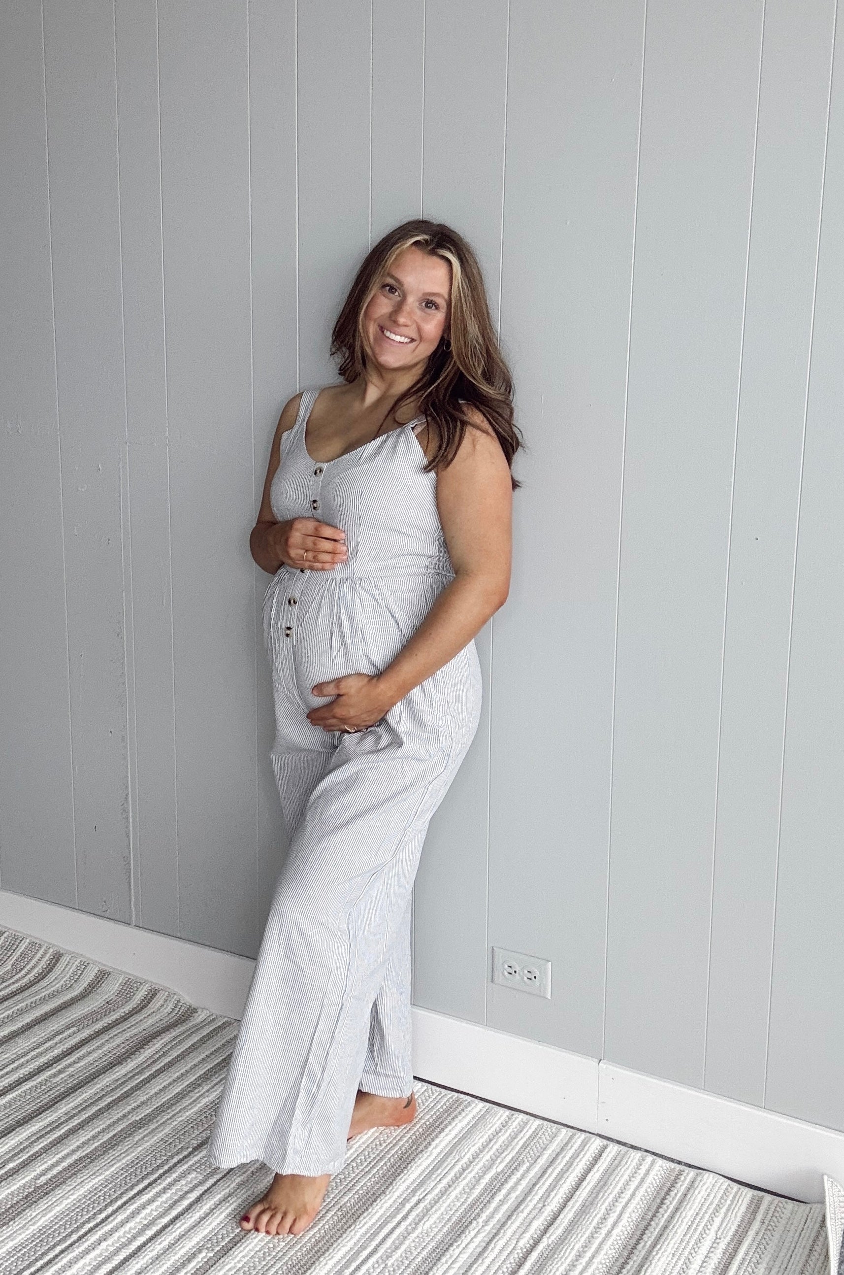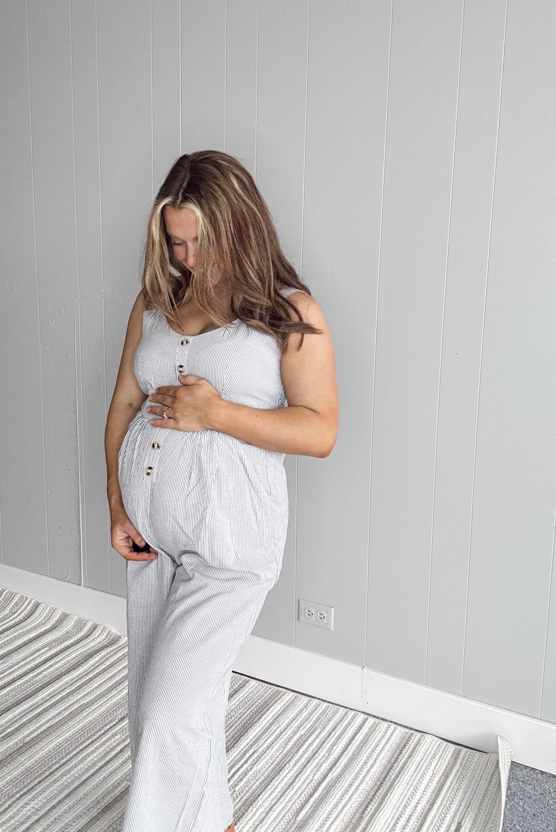 Chic, comfy, and effortlessly flattering—this jumpsuit is made for your everyday moments. The subtle pinstripe pattern, functional buttons, and wide-leg silhouette give it a timeless charm, while the lightweight fabric keeps it breathable and soft. Whether you’re running errands, chasing toddlers, or bumpin’ through your day, this one-piece wonder keeps you cute without trying too hard.