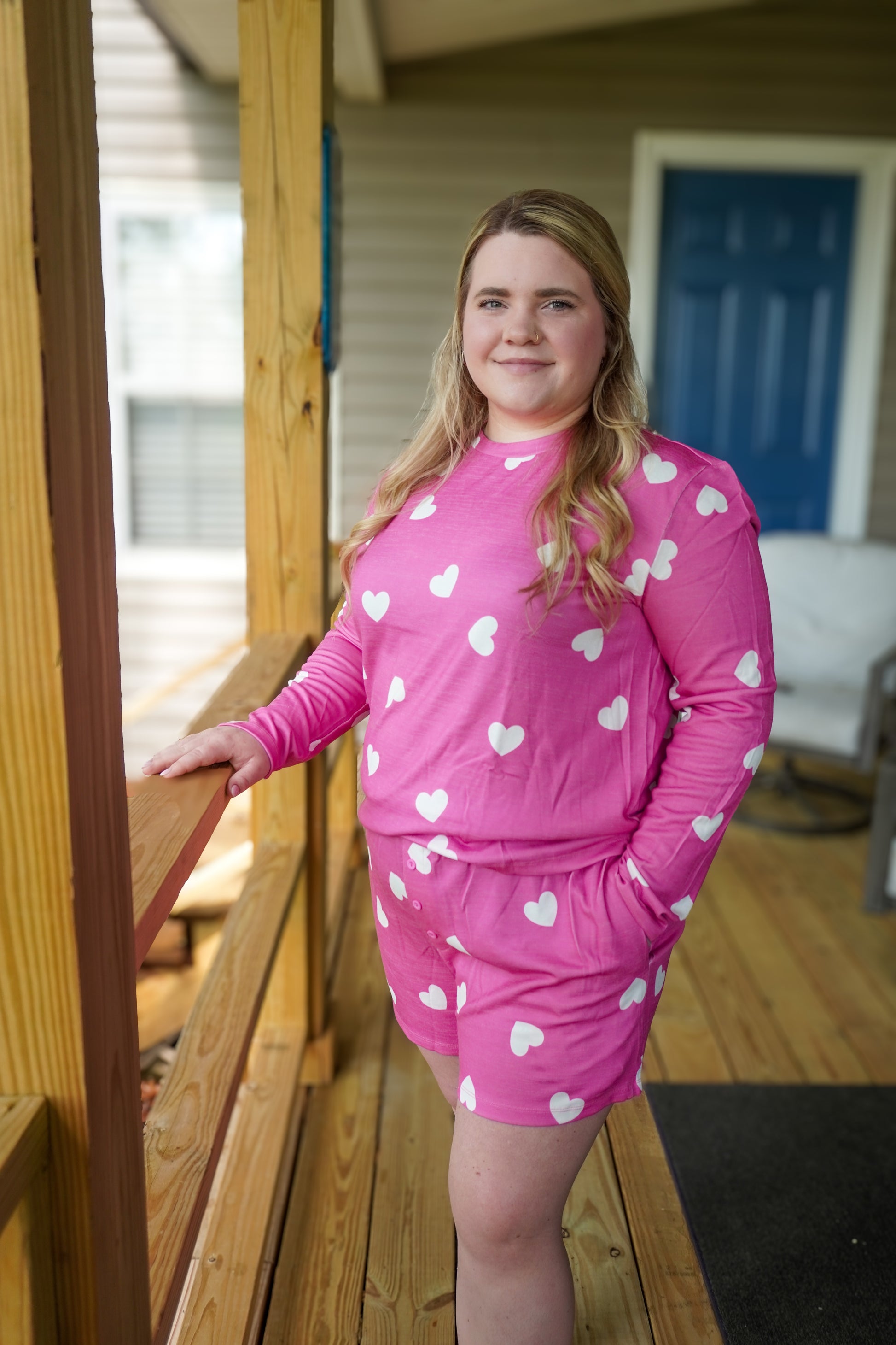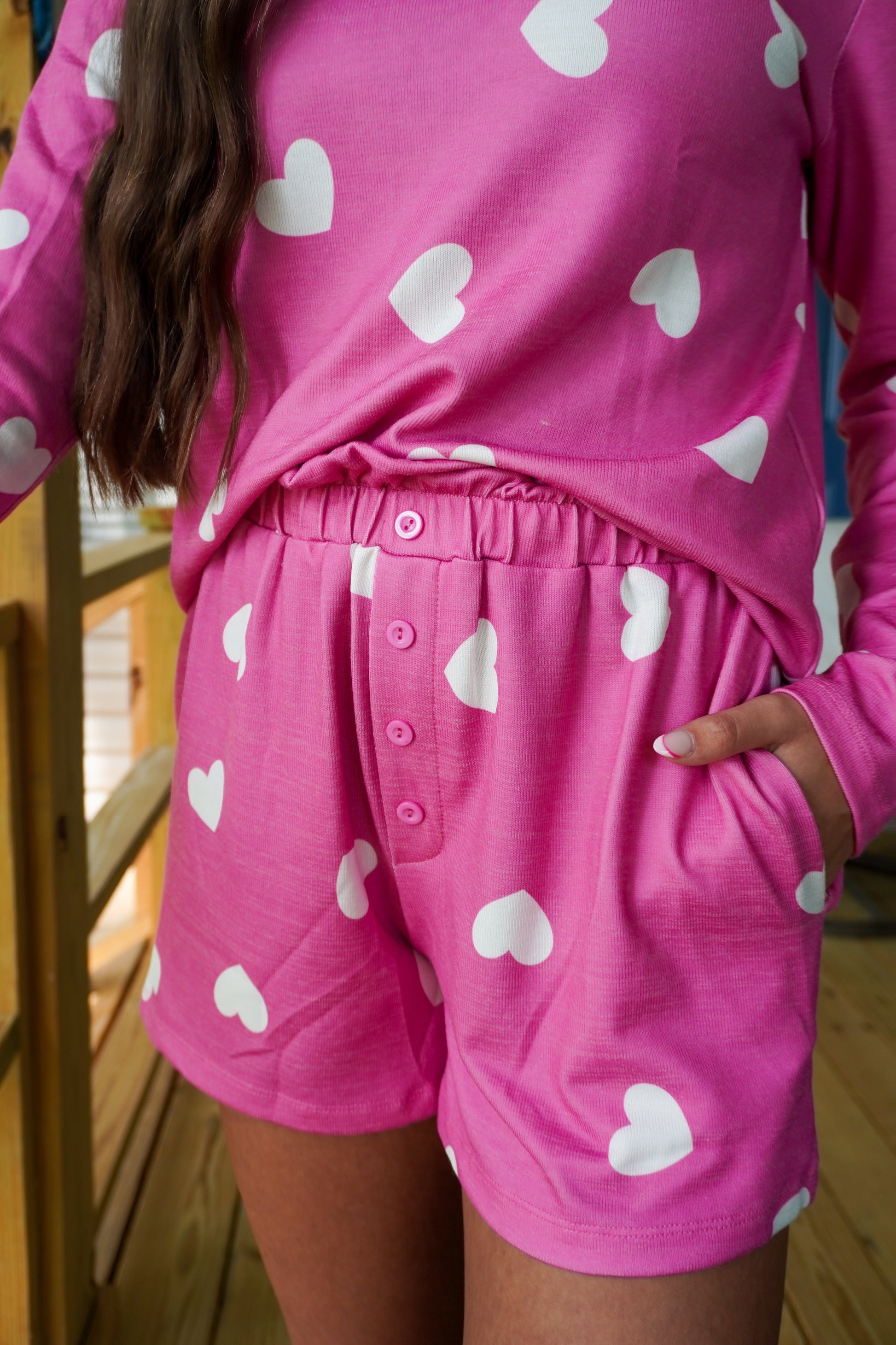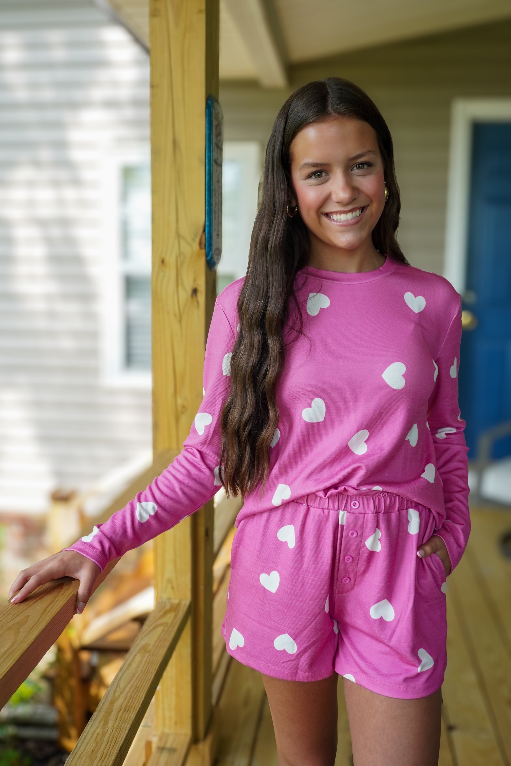 Comfy meets cute in the Heart to Lounge Set — the coziest way to say “I love you” to your downtime. This bubblegum pink set features a soft long-sleeve top and button-detailed shorts, both sprinkled with playful white hearts. Whether you’re winding down with your little ones, sipping coffee on the porch, or planning a self-care night, this set is your go-to for feel-good moments. Pockets included (because we know that matters).